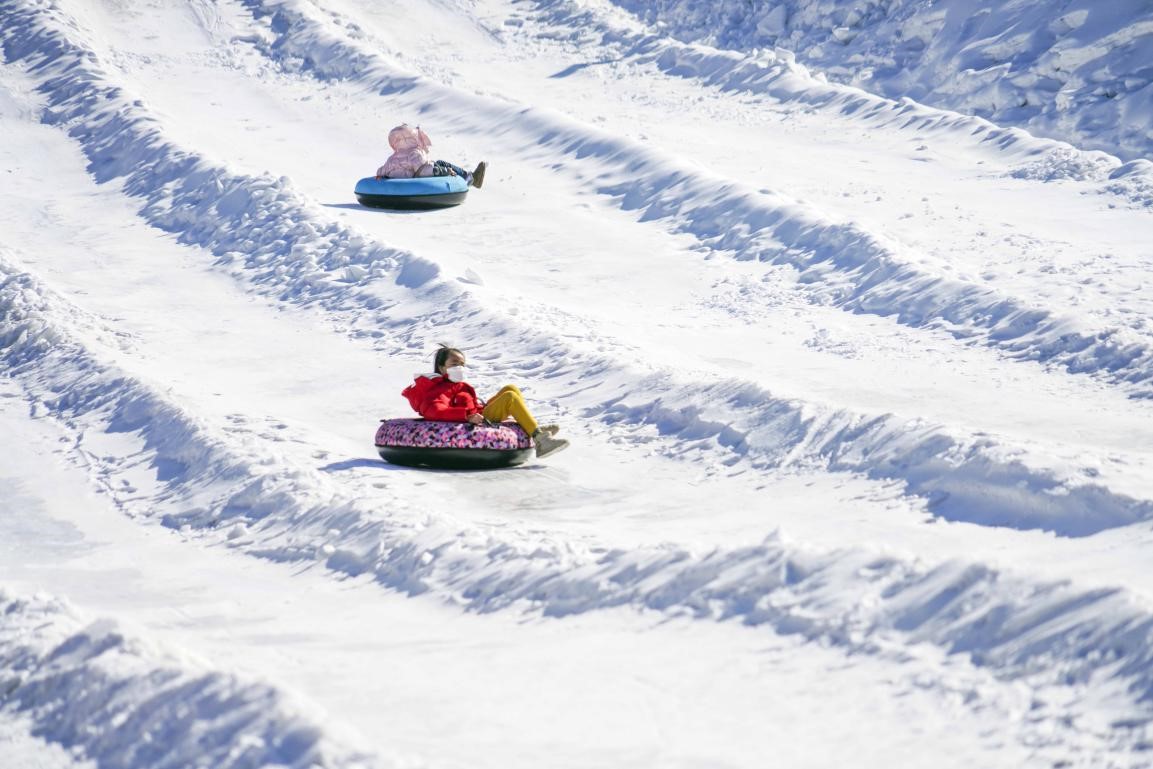 Children enjoy snow tubing at a skiing resort in Zunhua, north China's Hebei province, Feb. 20, 2022. (People's Daily Online/Liu Mancang)