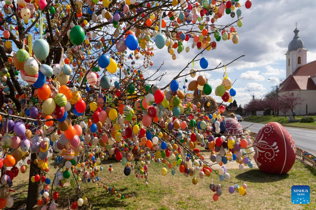 A tree decorated with Easter eggs is seen in the main square of Kethely, Western Hungary, on April 11, 2022. (Photo by Attila Volgyi/Xinhua)