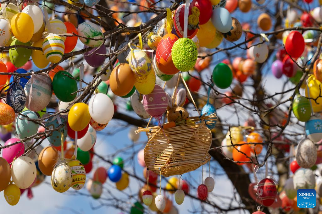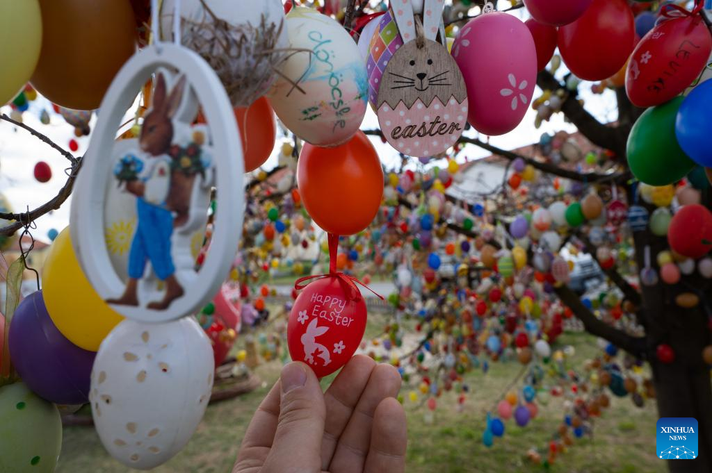 Easter decorations are seen in the main square of Kethely, Western Hungary, on April 11, 2022. (Photo by Attila Volgyi/Xinhua)