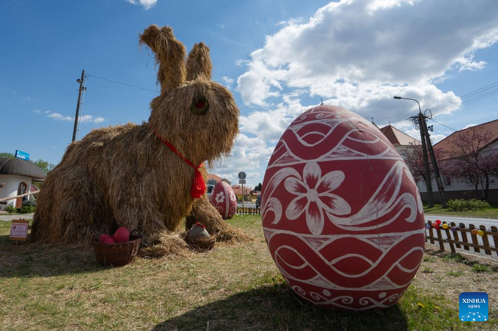 A giant Easter Bunny made of hay is seen among giant painted Easter eggs in the main square of Kethely, Western Hungary, on April 11, 2022. (Photo by Attila Volgyi/Xinhua)