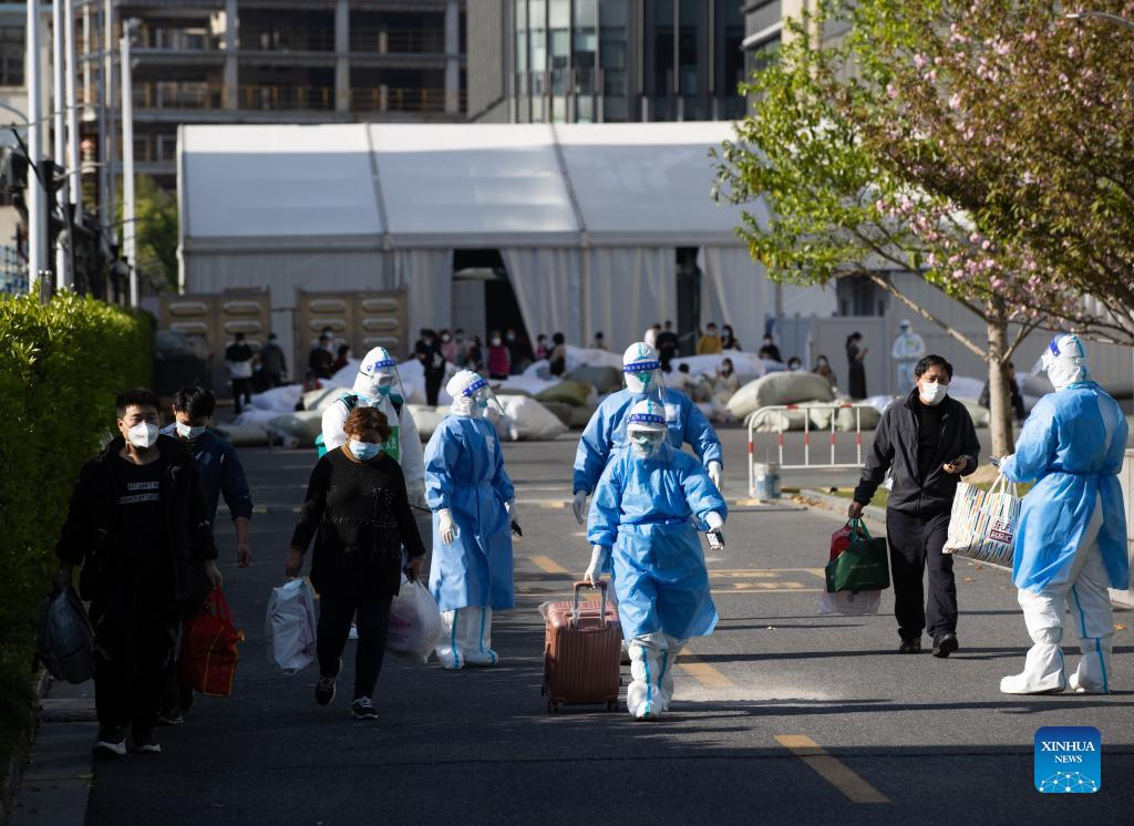 Patients who have recovered from COVID-19 leave a makeshift hospital converted from Shanghai Convention &Exhibition Center of International Sourcing in Shanghai, east China, April 9, 2022. The first group of 16 recovered COVID-19 patients left the makeshift hospital on Saturday. (Xinhua/Jin Liwang)