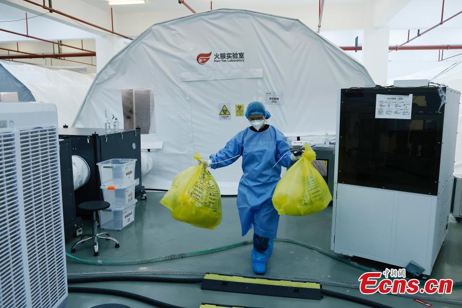 A medical work deals with medical wastes at Pudong Huoyan, or Fire Eye nucleic acid test laboratory, in east China's Shanghai, April 11, 2022. (Photo: China News Service/Yin Liqin)