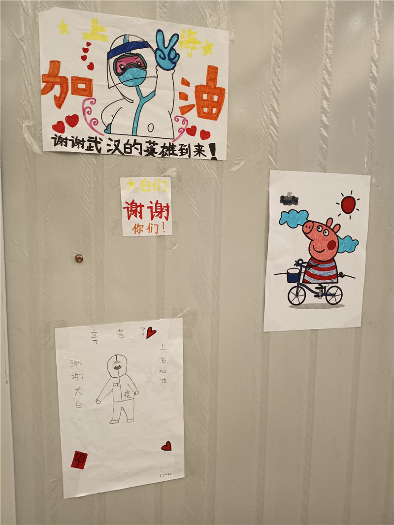Photo shows paintings drawn by children currently hospitalized at the Fangcang makeshift hospital for COVID-19 treatment that were created to show their gratitude towards medical workers who have taken care of them over the past few days. (Photo from Tongji Hospital affiliated to the Tongji Medical College of the Huazhong University of Science and Technology)