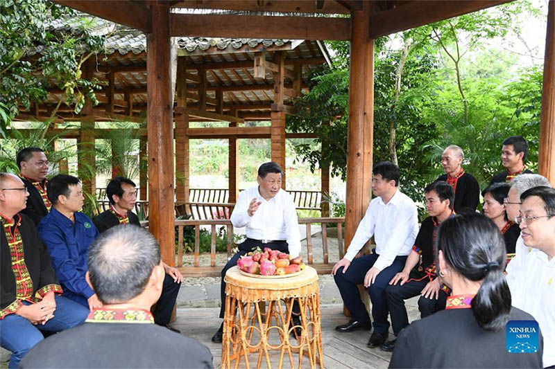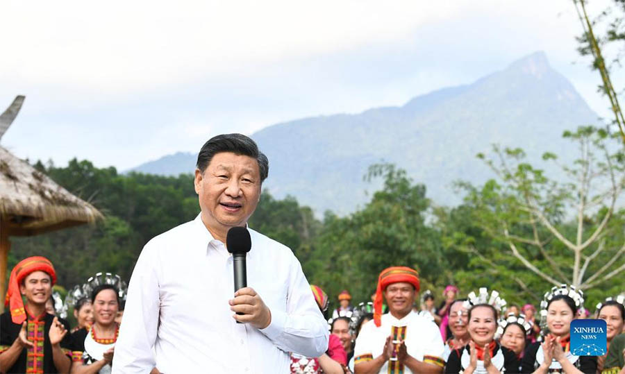 Chinese President Xi Jinping, also general secretary of the Communist Party of China Central Committee and chairman of the Central Military Commission, visits Maona, a village in the city of Wuzhishan, to learn about the alignment of rural revitalization with the achievements in poverty alleviation during his inspection tour in the southern province of Hainan, April 11, 2022. (Xinhua/Xie Huanchi)