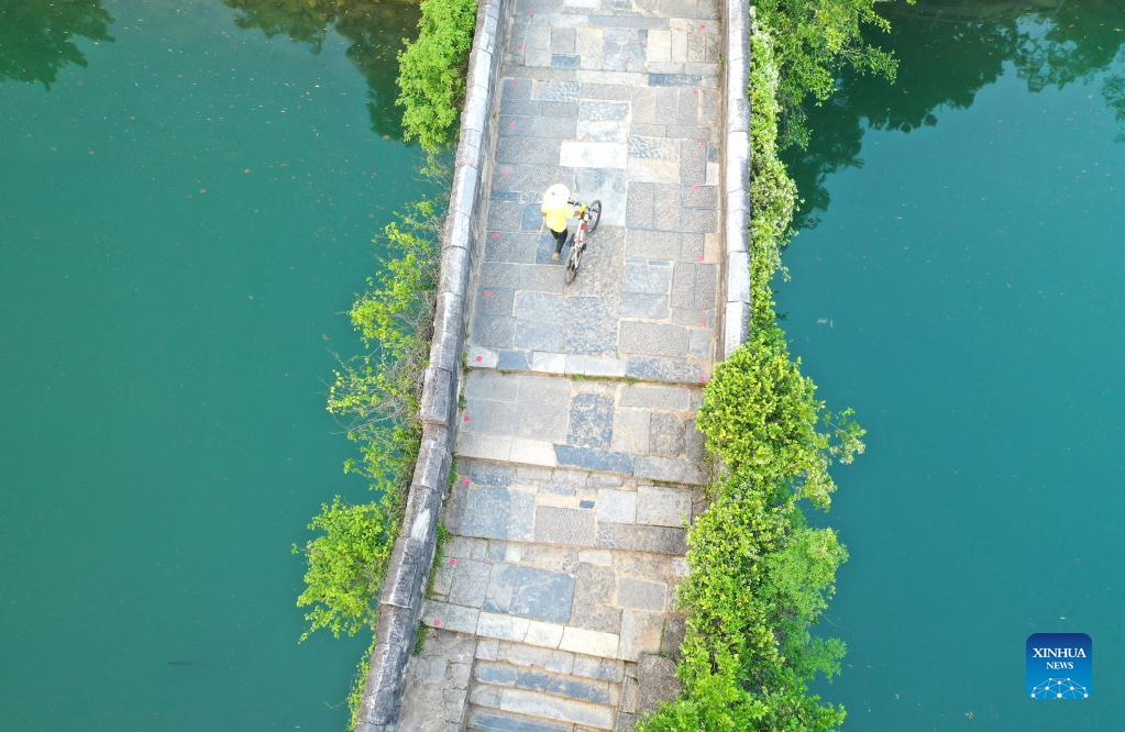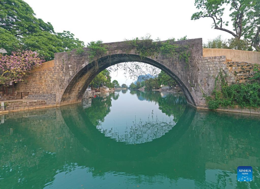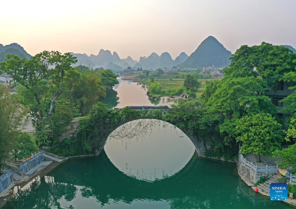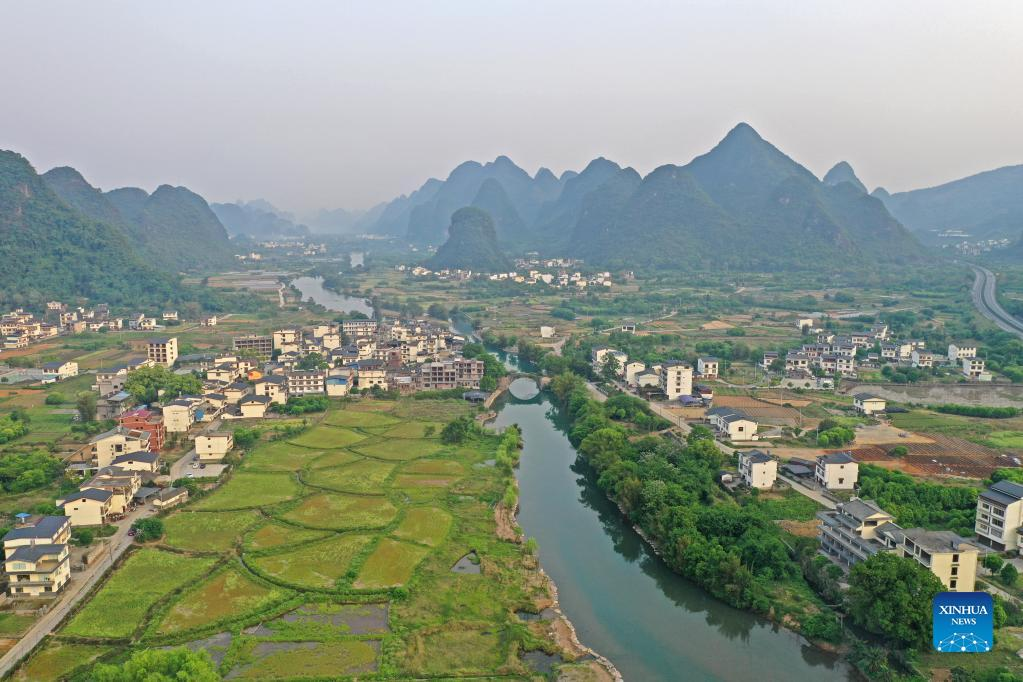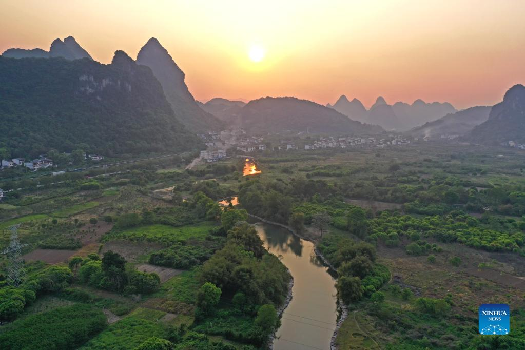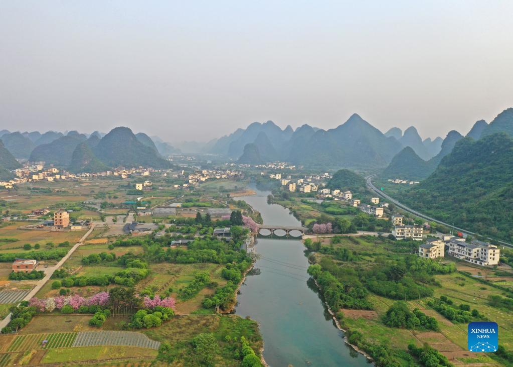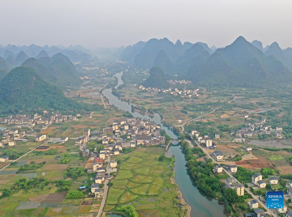 Aerial photo taken on April 11, 2022 shows the scenery along Yulong River in Yangshuo County, Guilin City, south China's Guangxi Zhuang Autonomous Region. (Xinhua/Zhou Hua)
