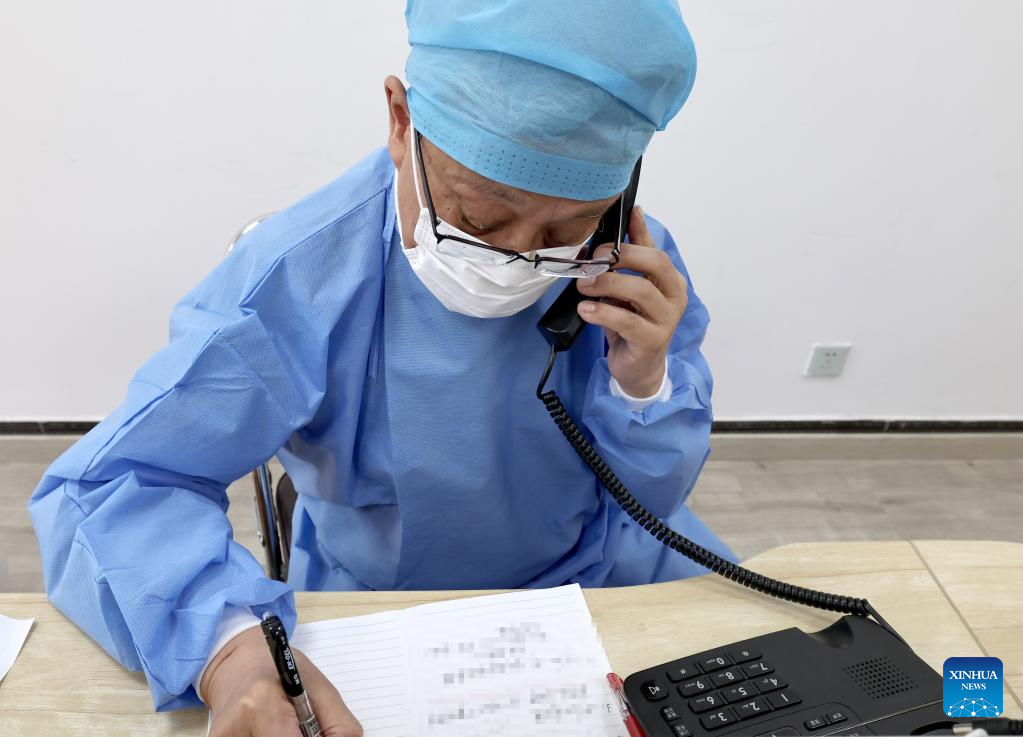 Wei Gang answers a phone call from residents in the office of neighborhood committee at a residential area in Baoshan District of Shanghai, east China, April 12, 2022. (Xinhua/Chen Jianli)