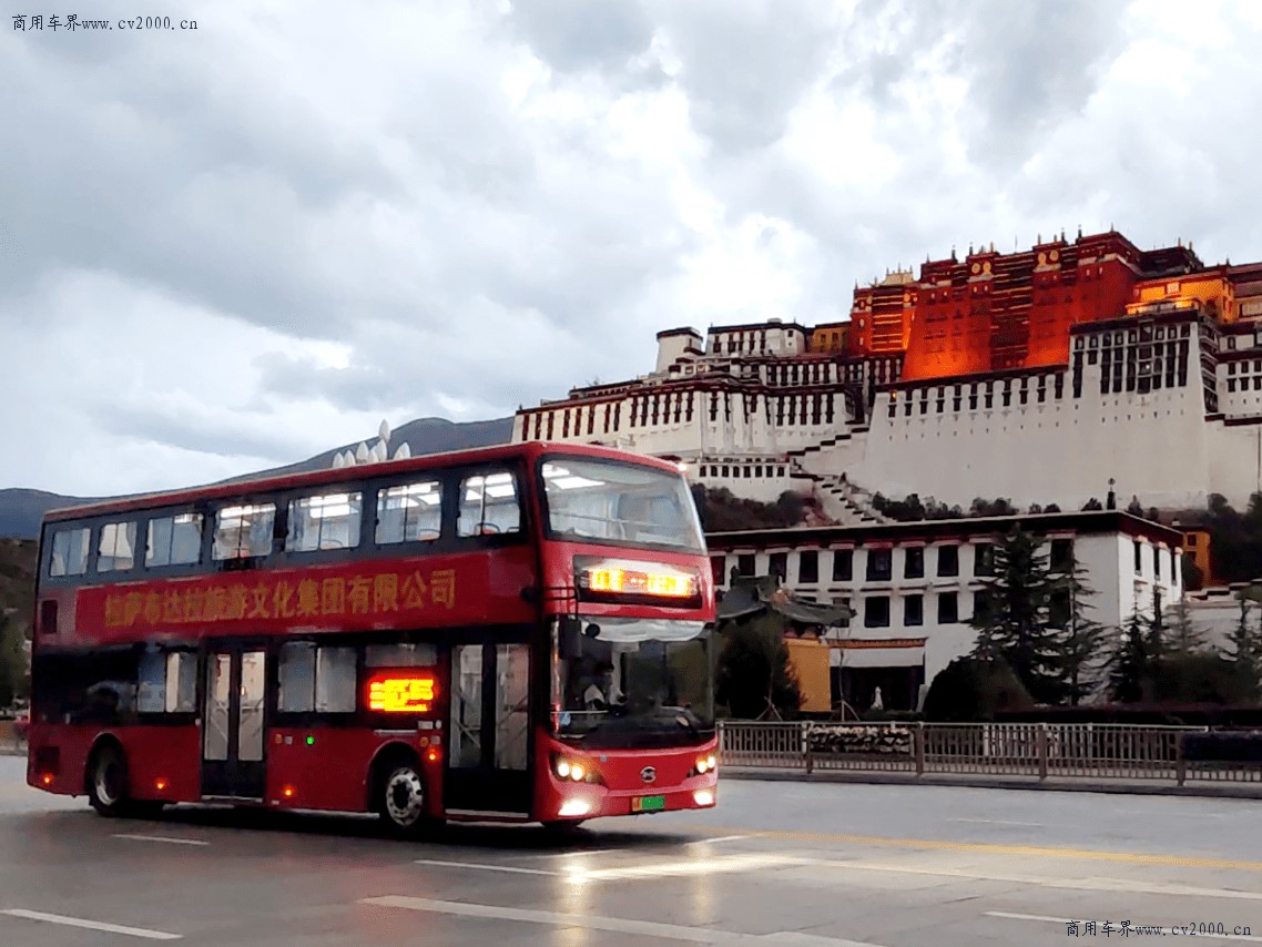 A double-decker pure electric tour bus manufactured by Chinese carmaker BYD drives by the Potala Palace, Lhasa. (Photo from BYD)