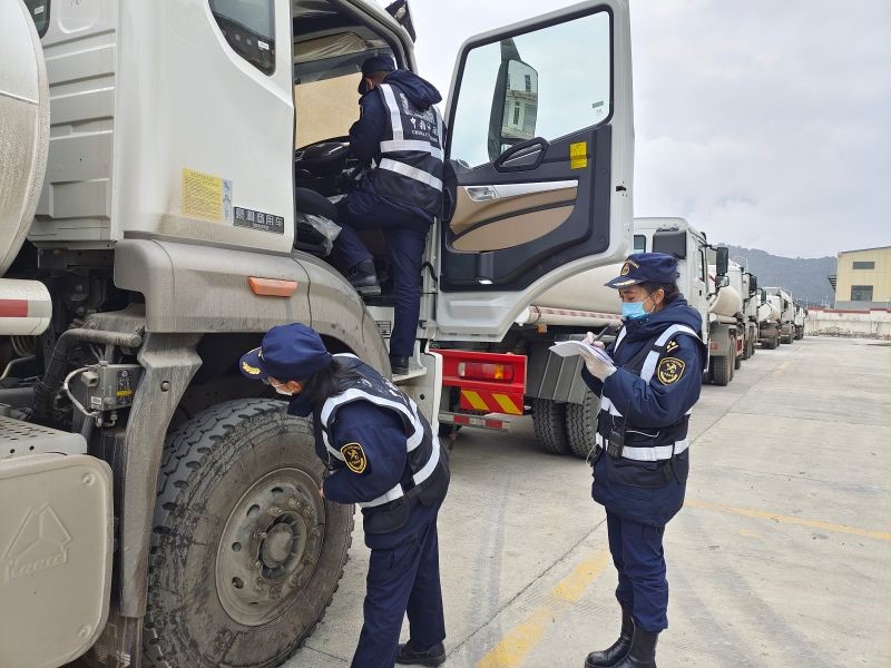 Officials with Lhasa customs examine trucks to be exported at Jilong Port. (Photo courtesy of Lhasa customs)