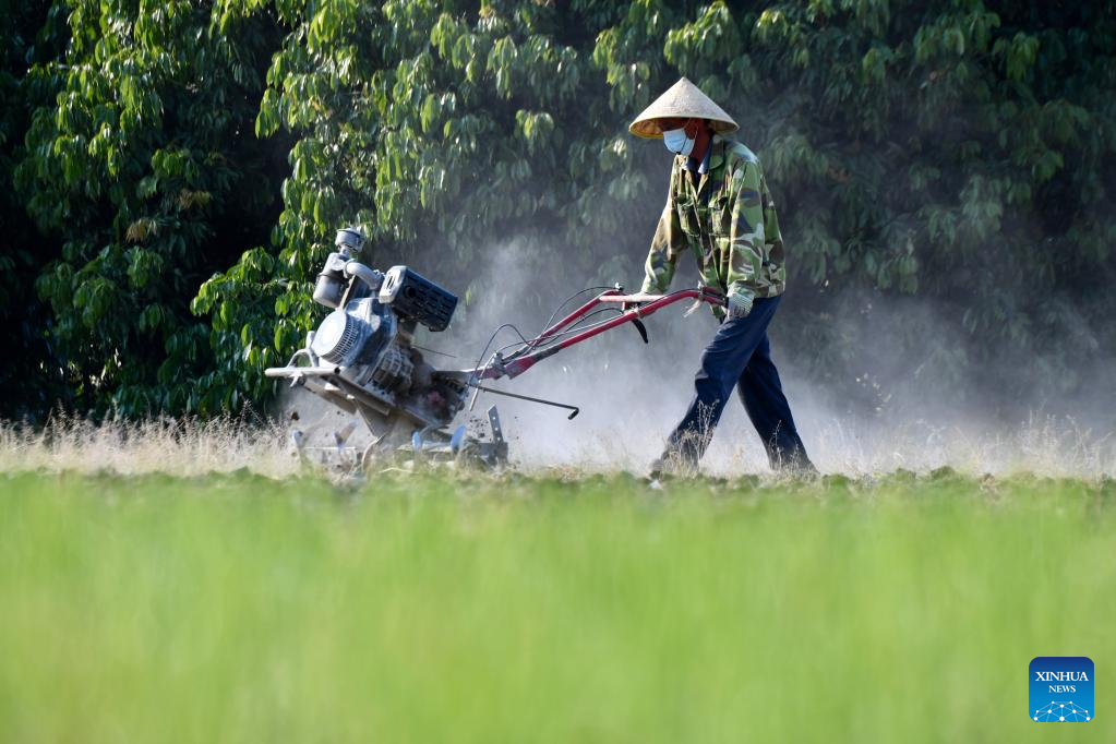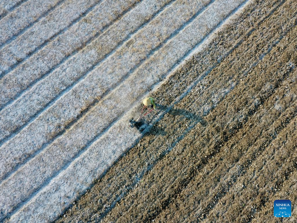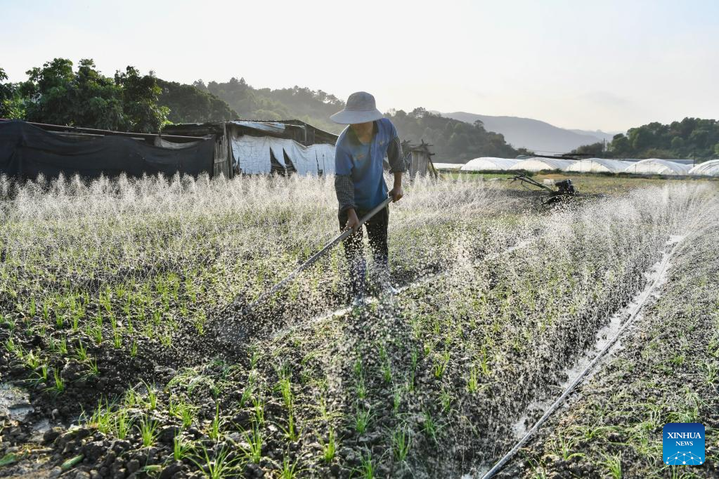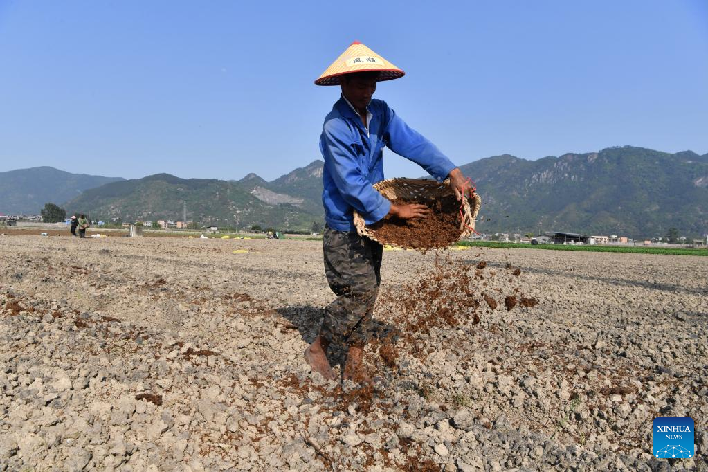 A farmer fertilizes a field at a vegetable and flower planting base in Nantong Township of Minhou County, southeast China's Fujian Province, April 12, 2022. (Xinhua/Jiang Kehong)