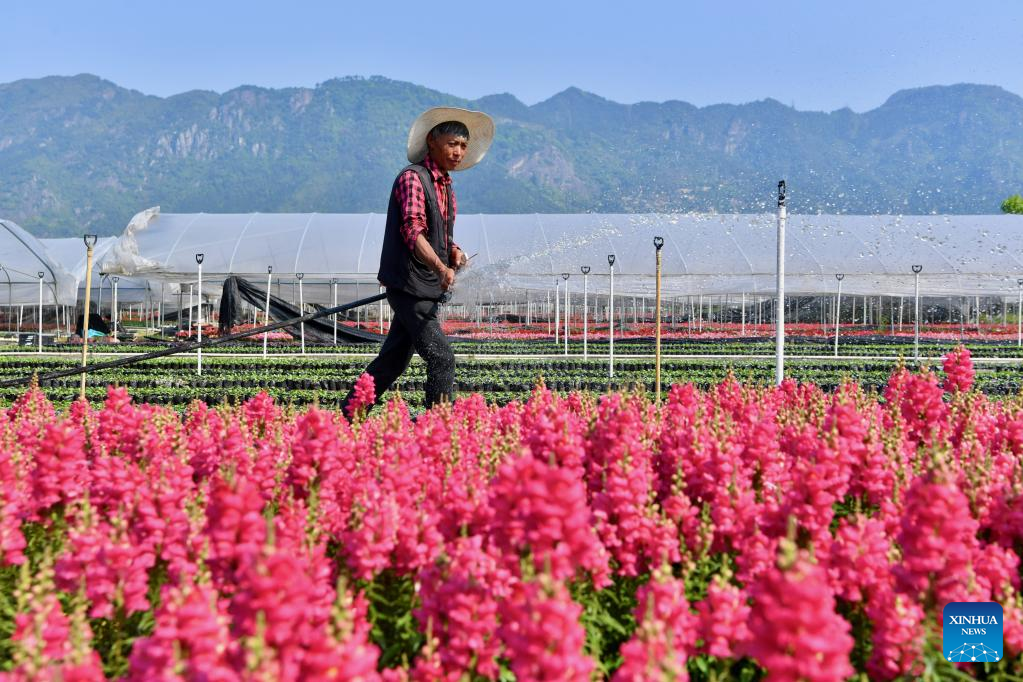 A farmer waters flowers at a vegetable and flower planting base in Nantong Township of Minhou County, southeast China's Fujian Province, April 12, 2022. (Xinhua/Jiang Kehong)