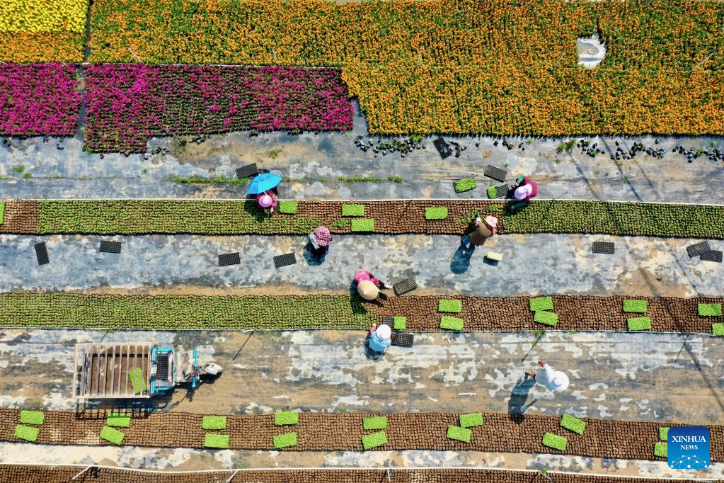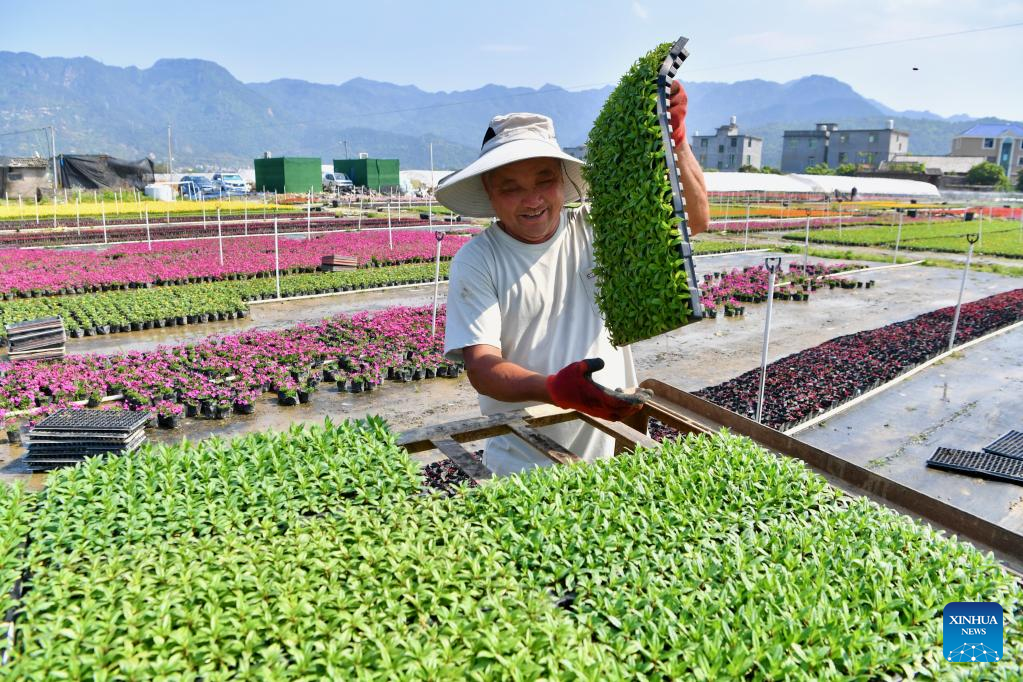 A farmer transports flower seedlings at a vegetable and flower planting base in Nantong Township of Minhou County, southeast China's Fujian Province, April 12, 2022. (Xinhua/Jiang Kehong)