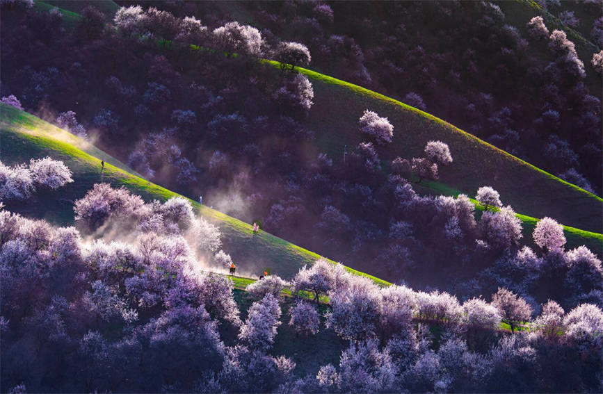 Spring is the best season for tourists to hike in the wild apricot forests of the Narathi Apricot Valley, Xinyuan county, northwest China's Xinjiang Uygur Autonomous Region. (Photo/Yang Xiaoqian)