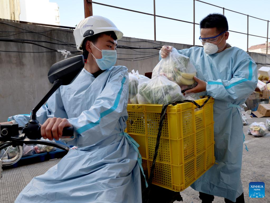 Cai Xiaobing (R), Fuquan branch manager of the delivery company YTO Express, helps a deliveryman load goods in east China's Shanghai, April 9, 2022. Cai Xiaobing is the branch manager of the delivery company YTO Express in Fuquan, Changning District, east China's Shanghai. Since early April, Cai has led his team to work around the clock to ensure delivery. They are now delivering daily supplies for about 2,000 households in several communities. (Xinhua/Chen Jianli)