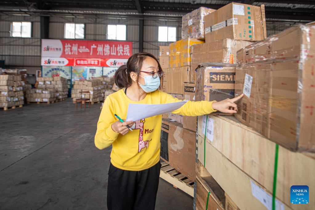 A staff member checks the packages at the warehouse of a logistics company at the Hangzhou Transfar highway port in Hangzhou, east China's Zhejiang Province, April 13, 2022.