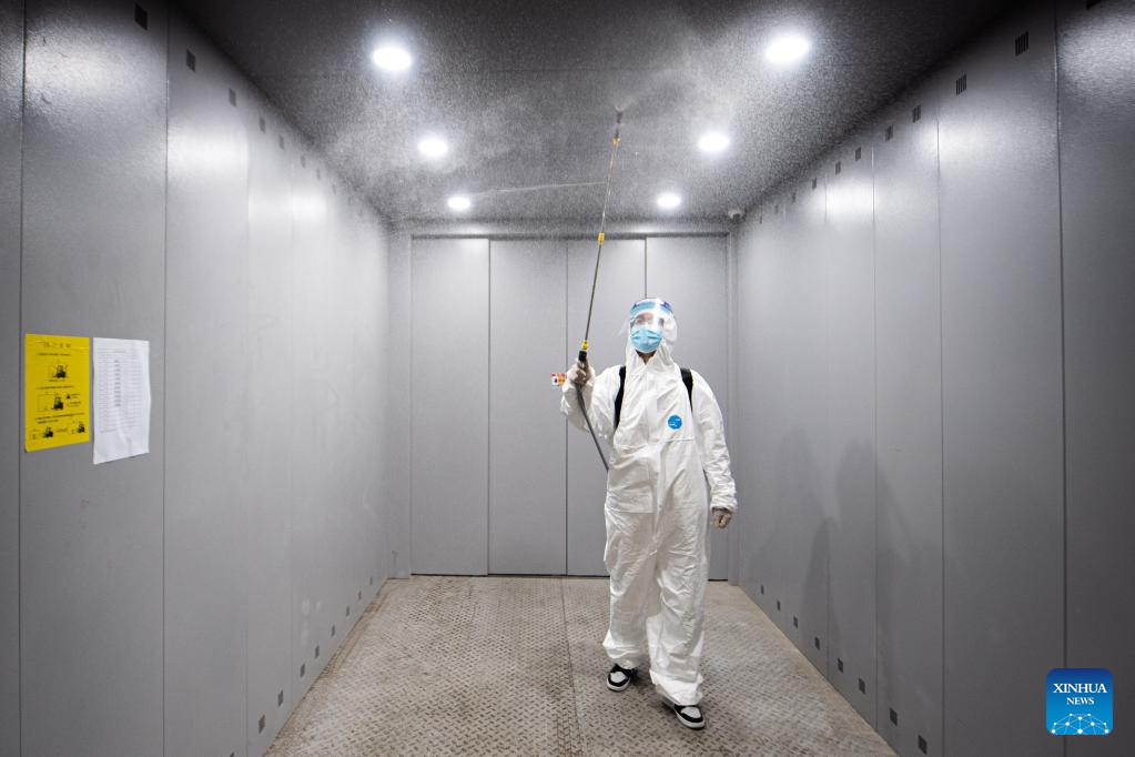 A staff member disinfects the warehouse which is used to store imported goods at the Hangzhou Transfar highway port in Hangzhou, east China's Zhejiang Province, April 13, 2022.