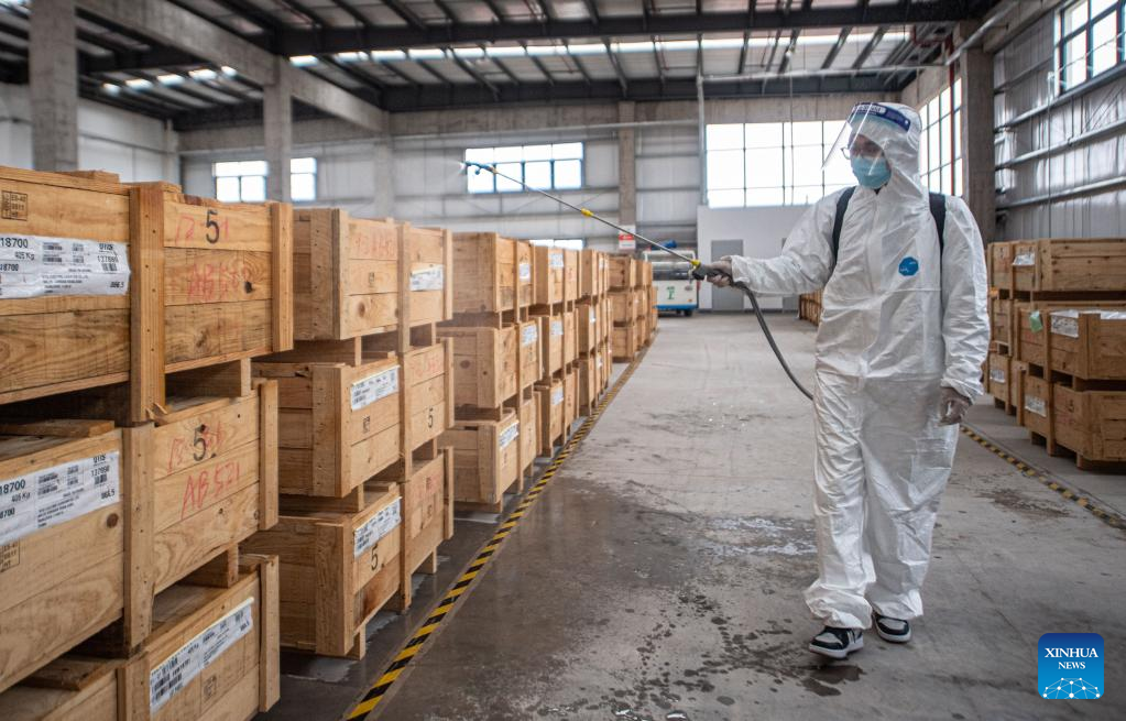 A staff member disinfects the imported goods stored at the warehouse at the Hangzhou Transfar highway port in Hangzhou, east China's Zhejiang Province, April 13, 2022.