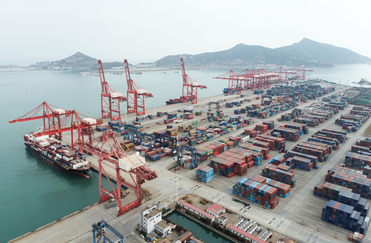 An aerial photo taken on March 7, 2021 shows the container terminal of the Lianyungang Port in Lianyungang city, East China's Jiangsu province. [Photo/Xinhua]