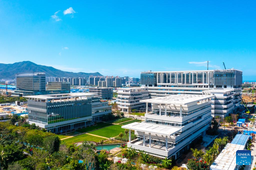 Aerial photo taken on March 30, 2022 shows a seed innovation research center at the Yazhou Bay science and technology city in Sanya, south China's Hainan Province. The Yazhou Bay Seed Laboratory, which opened in May last year, has gathered over 800 research staff to work toward seed industry innovation in Hainan in collaboration with 19 member institutions. The laboratory is situated in the Nanfan breeding base in Hainan, which is dubbed the "silicon valley" of China's seed industry. Thousands of scientists from across the country visit the base each year to undertake seed breeding, thanks to its unique light and heat resources. (Xinhua)