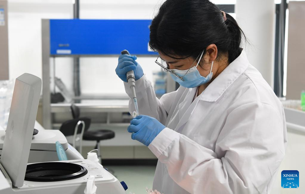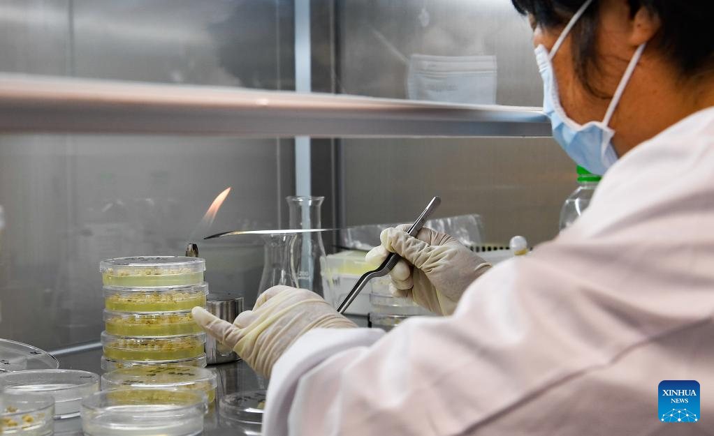 A researcher conducts experiments at the Yazhou Bay Seed Laboratory in Sanya, south China's Hainan Province, Nov. 23, 2021. The Yazhou Bay Seed Laboratory, which opened in May last year, has gathered over 800 research staff to work toward seed industry innovation in Hainan in collaboration with 19 member institutions. The laboratory is situated in the Nanfan breeding base in Hainan, which is dubbed the "silicon valley" of China's seed industry. Thousands of scientists from across the country visit the base each year to undertake seed breeding, thanks to its unique light and heat resources. (Xinhua/Yang Guanyu)