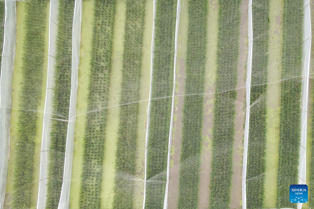 A researcher conducts rice hybridization experiments at the Nanfan seed breeding base in Sanya, south China's Hainan Province, April 1, 2022. The Yazhou Bay Seed Laboratory, which opened in May last year, has gathered over 800 research staff to work toward seed industry innovation in Hainan in collaboration with 19 member institutions. The laboratory is situated in the Nanfan breeding base in Hainan, which is dubbed the "silicon valley" of China's seed industry. Thousands of scientists from across the country visit the base each year to undertake seed breeding, thanks to its unique light and heat resources. (Xinhua/Zhang Liyun)