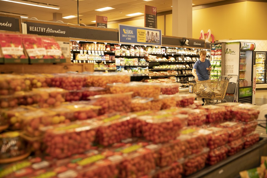 A consumer selects food at a supermarket in Millbrae, the United States, March 10, 2022. (Photo by Li Jianguo/Xinhua)