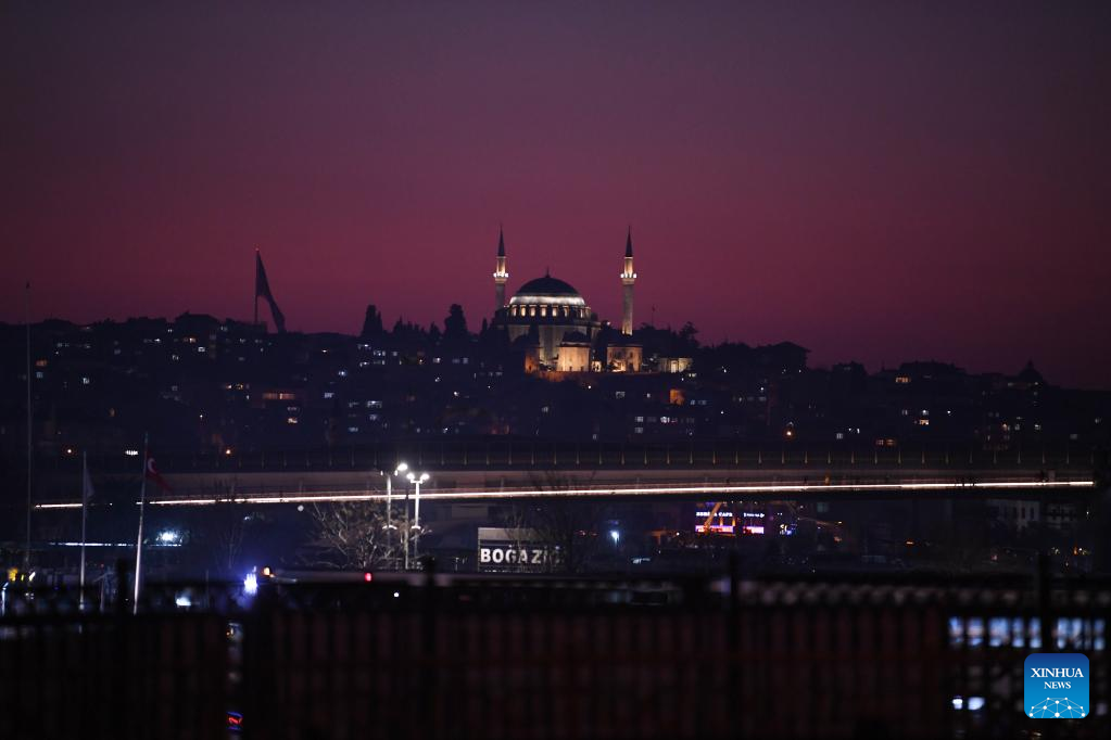 Photo taken on April 13, 2022 shows the sunset scenery of Istanbul, Turkey. (Xinhua/Shadati)