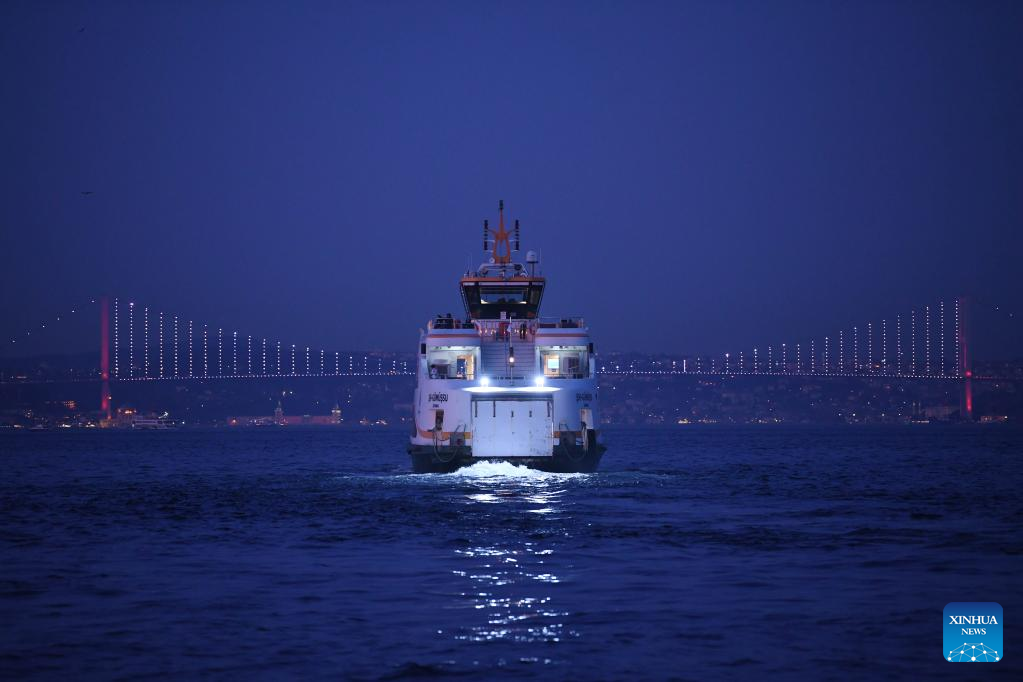 A cruise ship sails on the Bosporus Strait in Istanbul, Turkey, April 13, 2022. (Xinhua/Shadati)