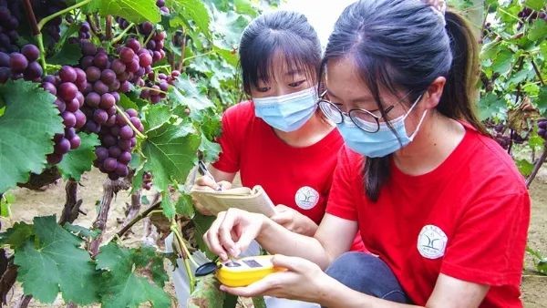 Postgraduates from the China Agricultural University, who are staying at a “science and technology backyard” in Qianya village, Quzhou county, Handan city, north China’s Hebei province, measure the sugar degree in Kyoho grapes grown by local people, Sept. 23, 2021. (Photo/China Agricultural University)
