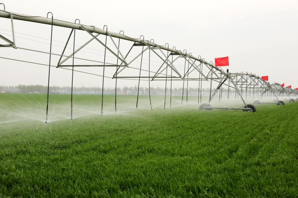 A 500-meter-long self-propelled truss sprinkler irrigates a wheat field in Lique township, Guangrao county, Dongying city, east China’s Shandong province, April 11, 2022. (People’s Daily Online/Zhou Guangxue)
