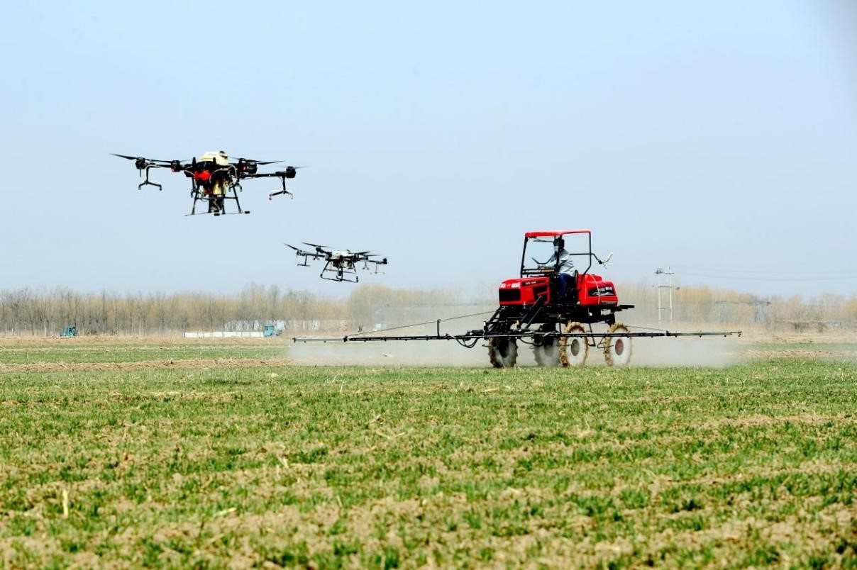 A farmer drives plant protection machine to spray pesticide in a wheat field of a family farm in Shikou township, Dongying city, east China’s Shandong province, March 10, 2022. (People’s Daily Online/Liu Zhifeng)