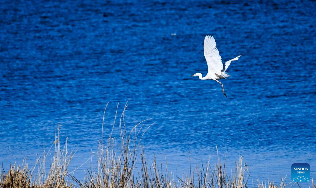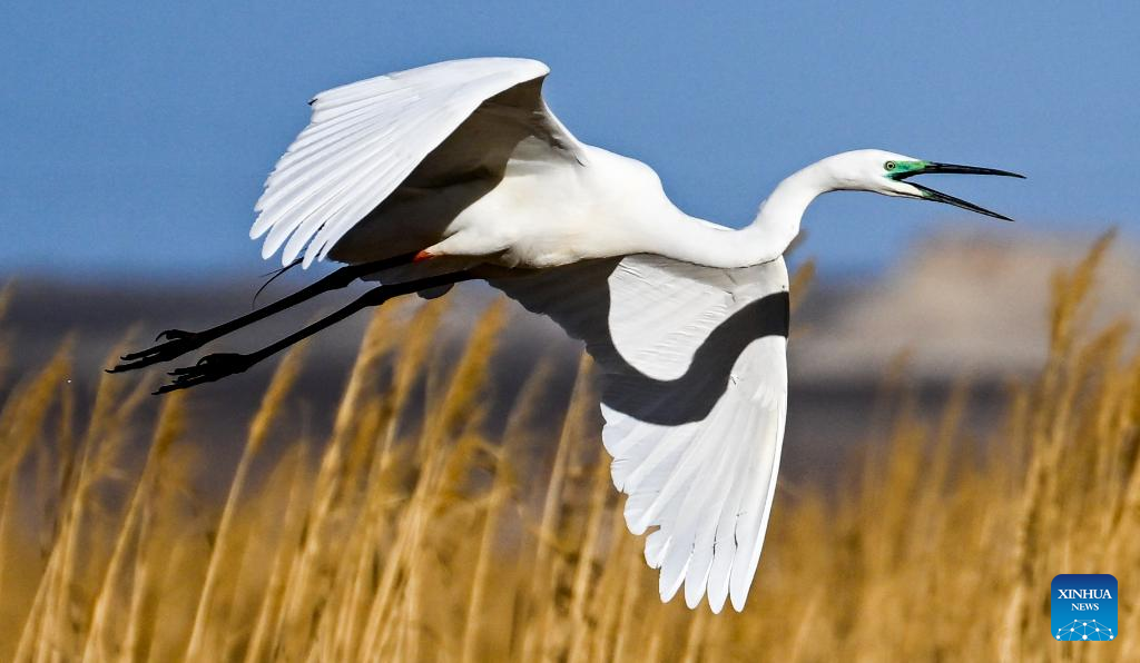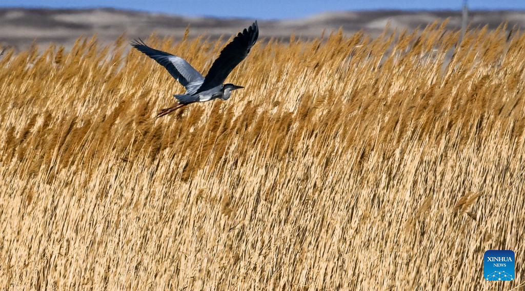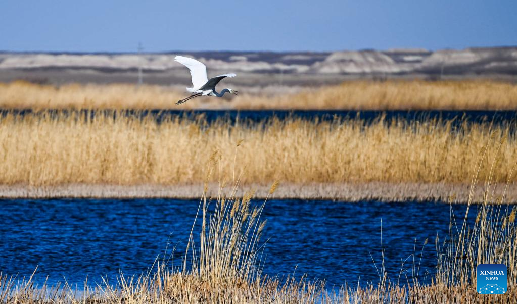 A migrant bird is pictured at Juyanhai wetland in Ejina Banner of Alxa League, north China's Inner Mongolia Autonomous Region, April 13, 2022. (Xinhua/Lian Zhen)