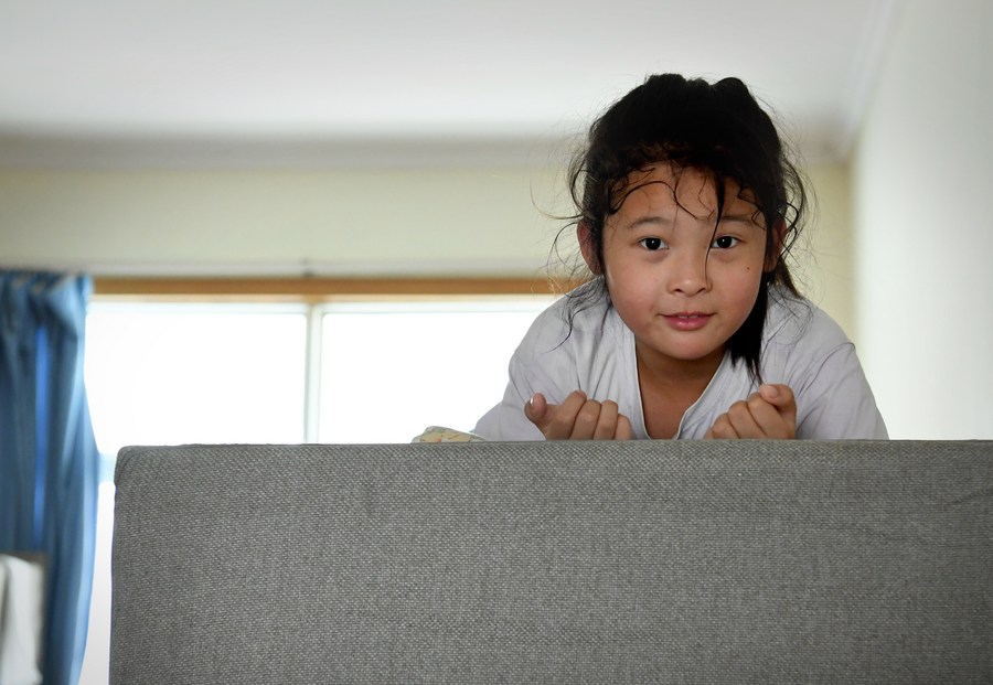 A girl rests in a dormitory at a temporary relocation site in a middle school in Xunxian County of Hebi City, central China's Henan Province, July 30, 2021. (Xinhua/Li An)