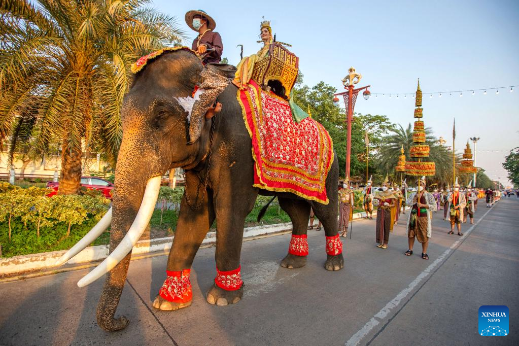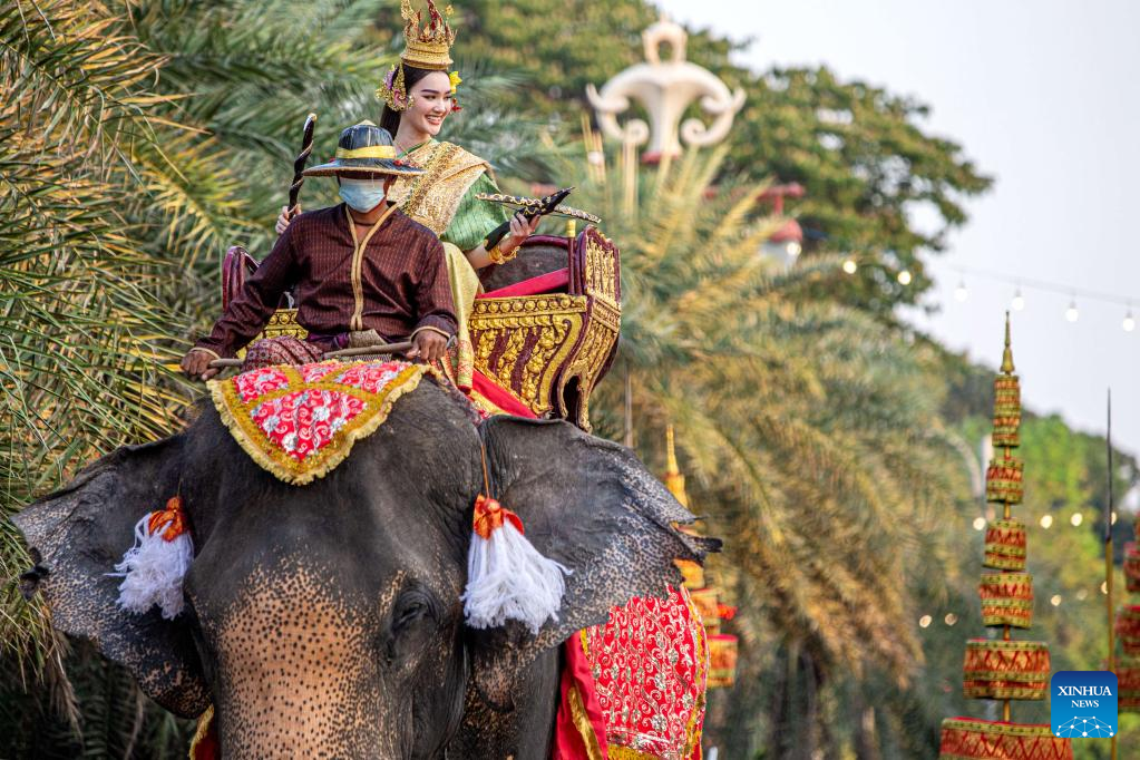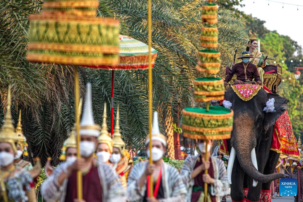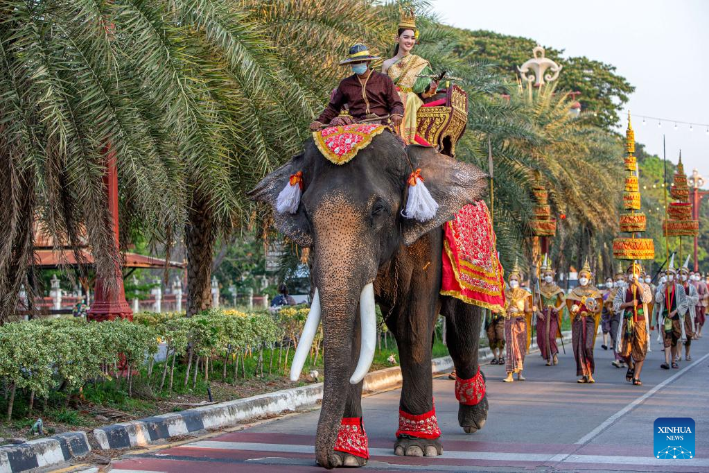 Performers participate in a street parade celebrating the Songkran Festival in Ayutthaya, Thailand, April 13, 2022. The Tourism Authority of Thailand held a street parade in Ayutthaya to celebrate the Songkran Festival.