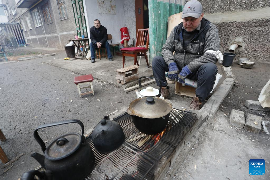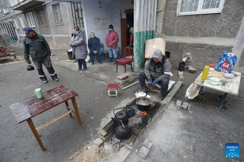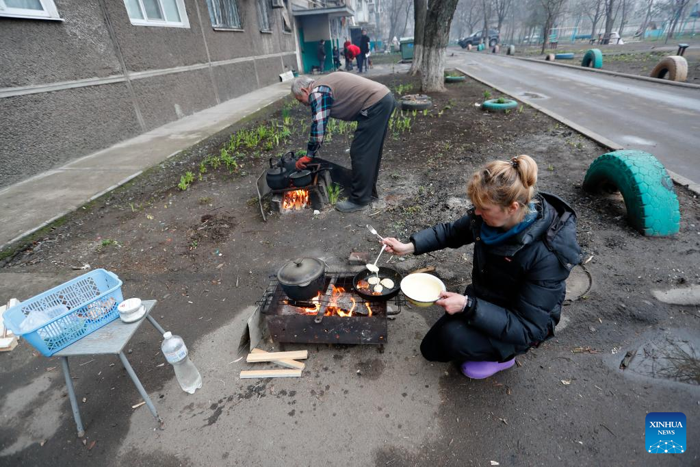 Residents cook outdoors in Mariupol, April 12, 2022. (Photo by Victor/Xinhua)