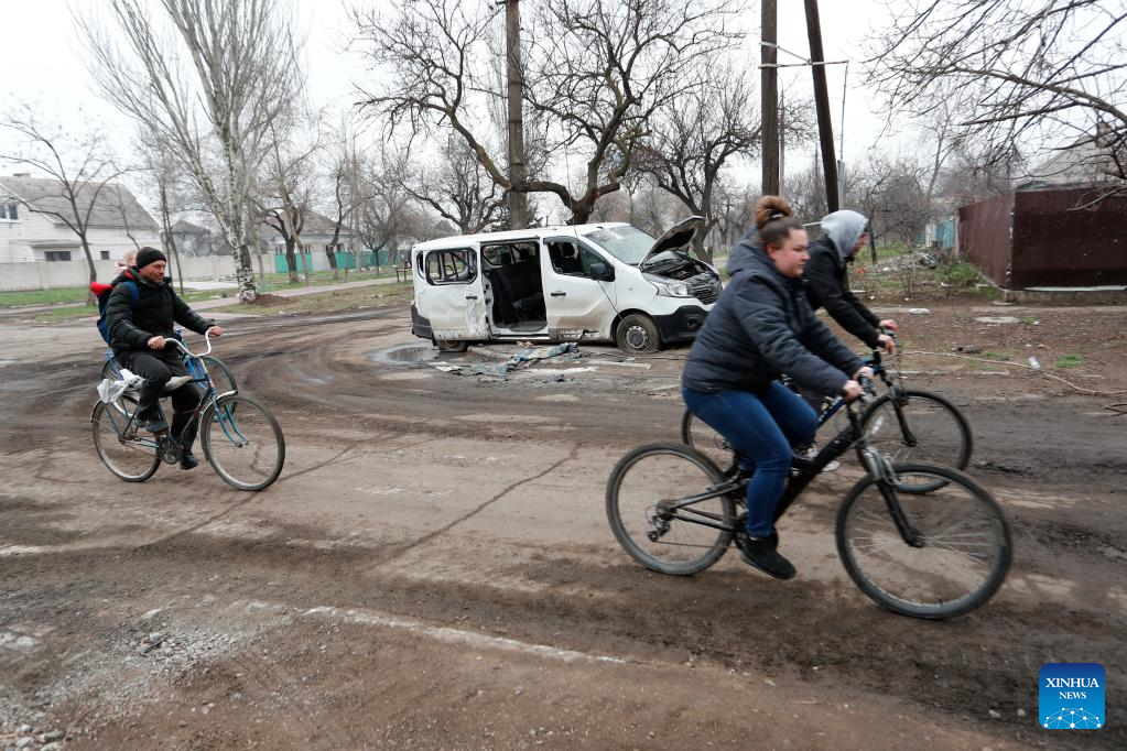 Residents pass by a damaged vehicle in Mariupol, April 12, 2022. (Photo by Victor/Xinhua)