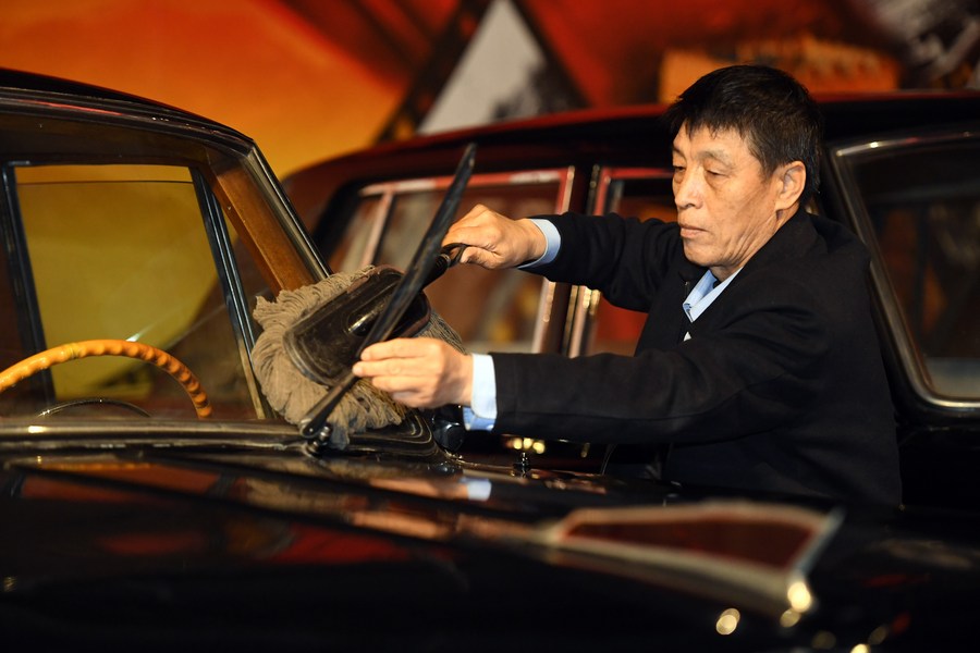 Luo Wenyou, owner of the Beijing Classic Car Museum, cleans the windshield of a vintage car in the museum in Beijing, capital of China, April 11, 2022. (Xinhua/Ren Chao)