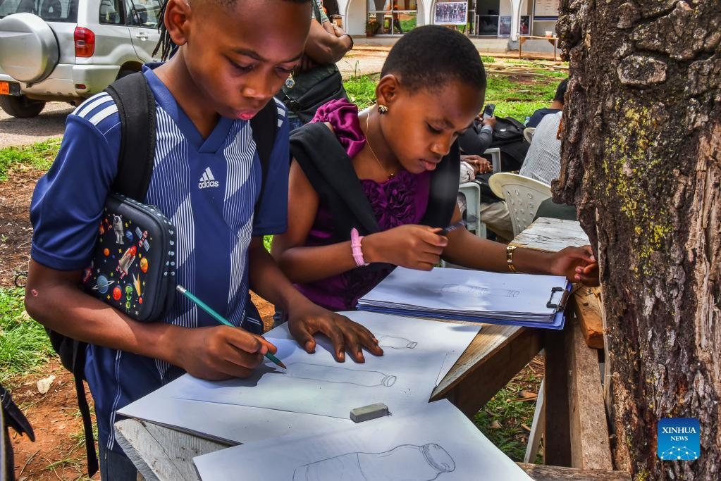 Children learn drawing at National Museum in Yaounde, Cameroon, on April 13, 2022. Celebrations to mark the World Art Day were held in Yaounde from April 12 to April 14. (Photo by Kepseu/Xinhua)