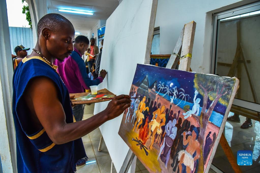 Painters work on their artworks at National Museum in Yaounde, Cameroon, on April 13, 2022. Celebrations to mark the World Art Day were held in Yaounde from April 12 to April 14. (Photo by Kepseu/Xinhua)