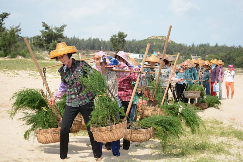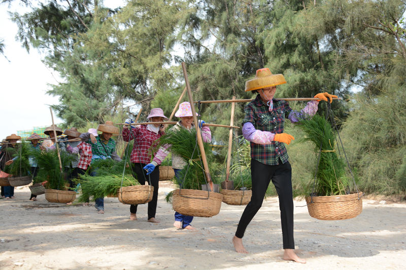 Photo shows Tao Fengjiao and women in her community carrying saplings on their shoulders and walking barefoot across the scorching sand in Qizi Bay, Changjiang Li Autonomous County in south China’s Hainan Province. (Photo courtesy of the Media Convergence Center of Changjiang Li Autonomous County)