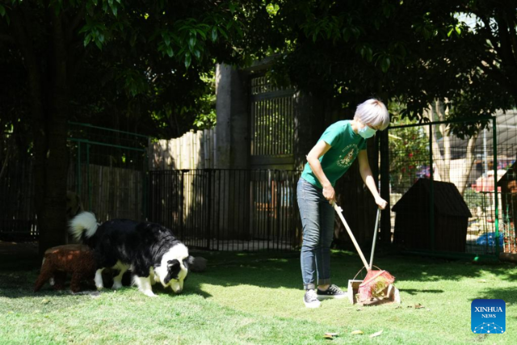 A staff member cleans the lawn at a pet-care center which helps look after pets belonging to quarantined people in Changsha, capital city of central China's Hunan Province, April 7, 2022. (Xinhua/Xue Yuge)