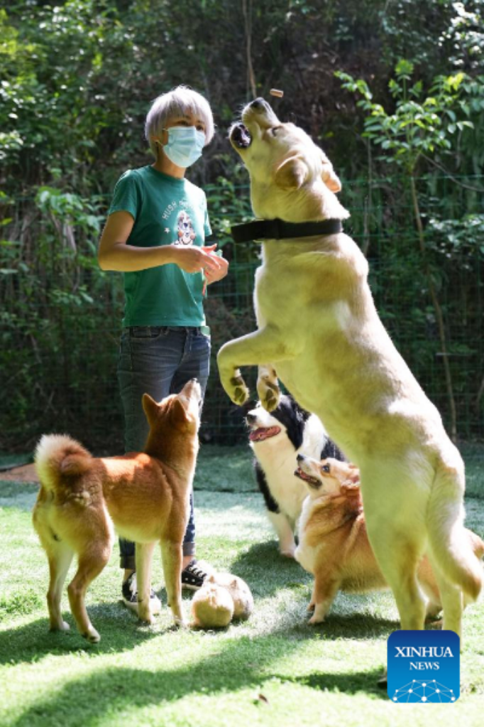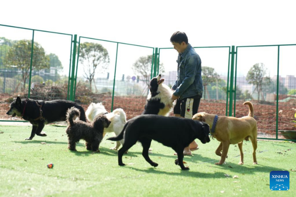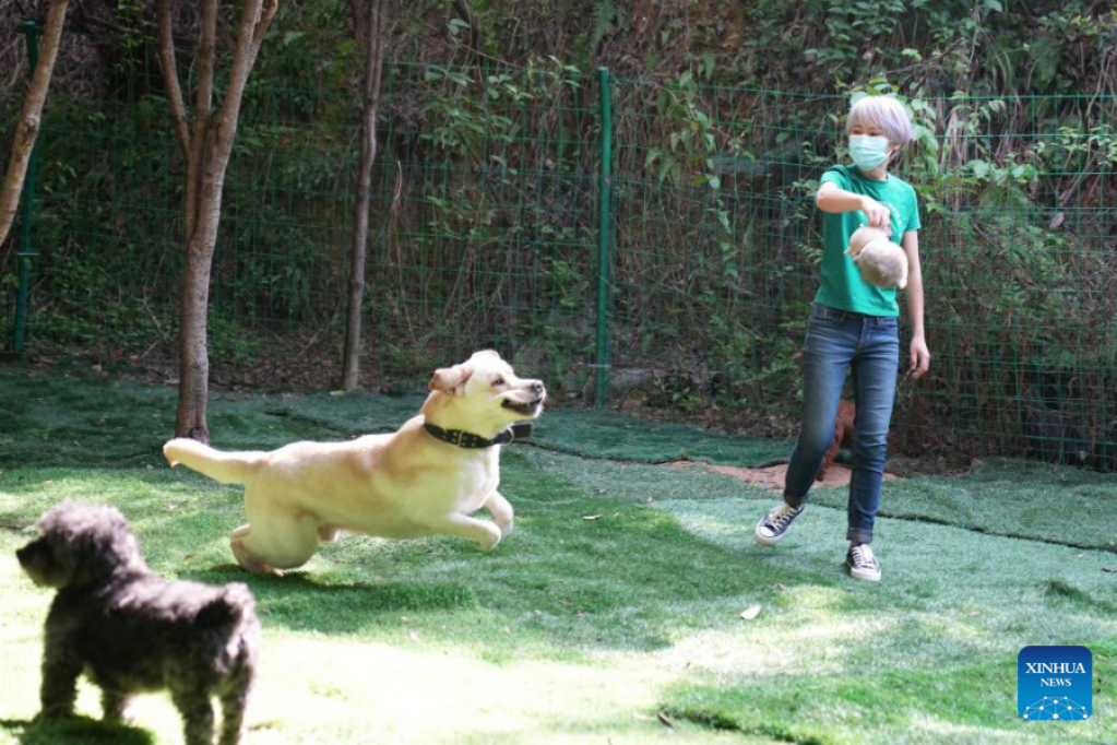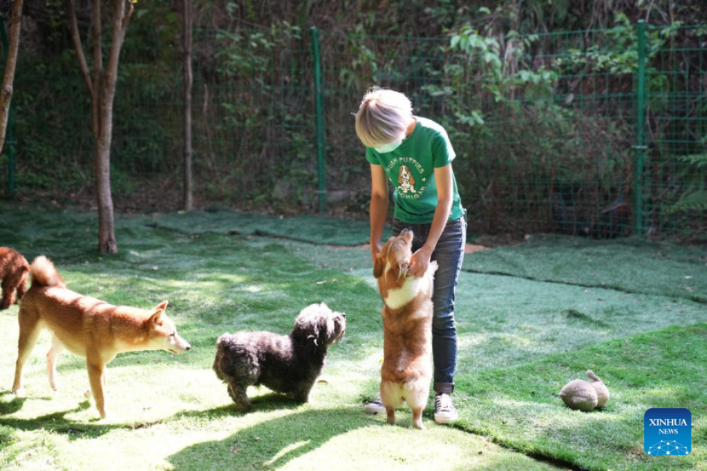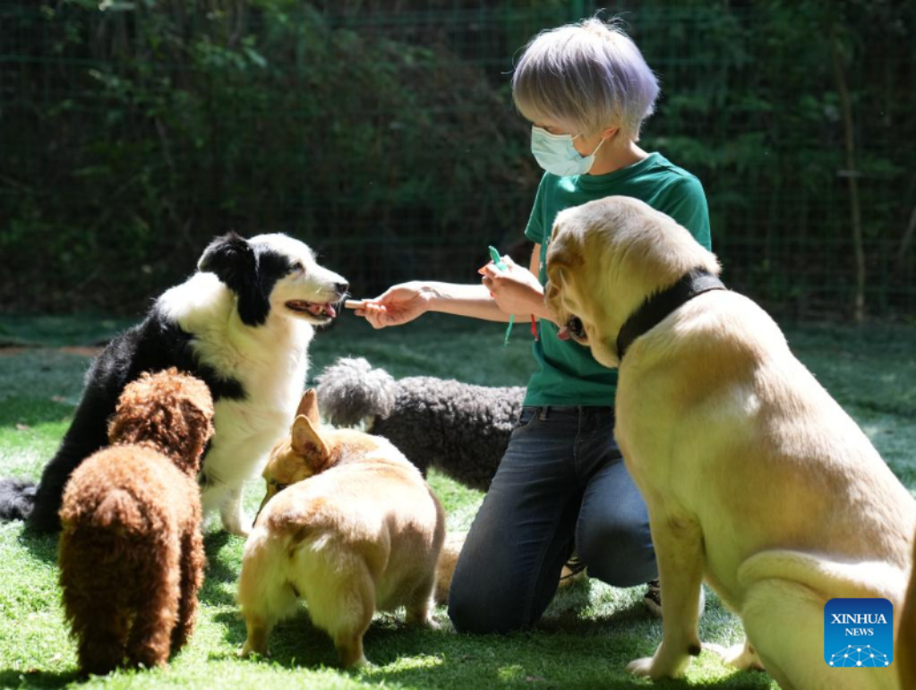A staff member plays with dogs at a pet-care center which helps look after pets belonging to quarantined people in Changsha, capital city of central China's Hunan Province, April 7, 2022.(Xinhua/Xue Yuge)