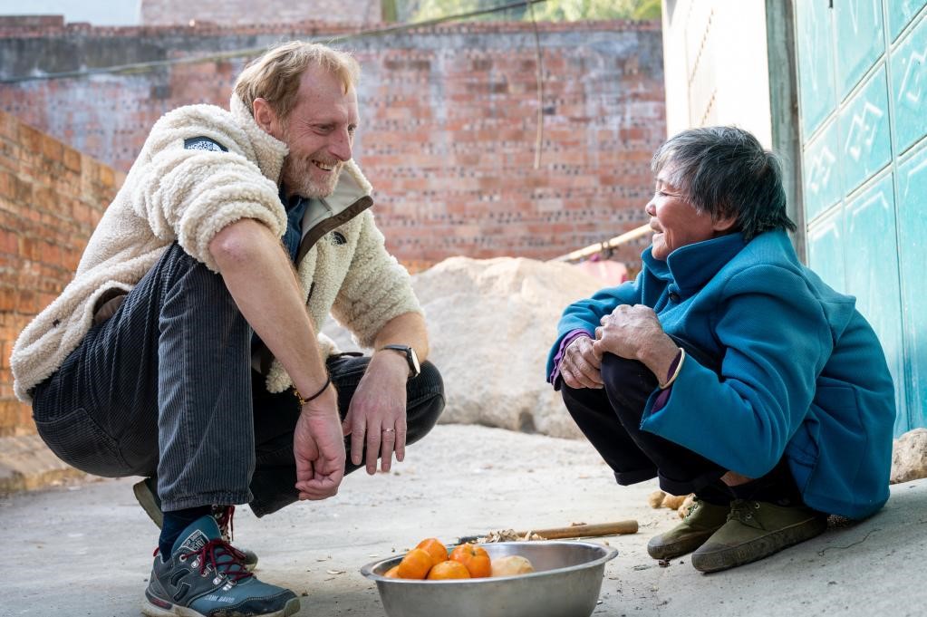 Nick, a retired police officer from Luxembourg, talks with a resident in Zhadong village, Hechi city, south China’s Guangxi Zhuang autonomous region. (Photo/Yan Lizheng)