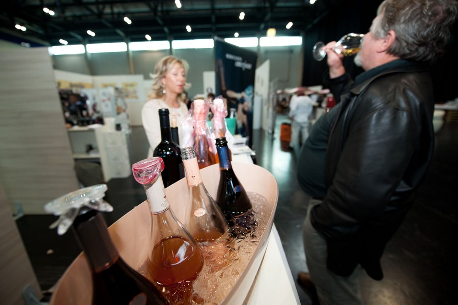 Visitors sample wine during the FoodItalia fair in Vienna, Austria, Oct. 3, 2014. (Xinhua/Qian Yi) (zhf)