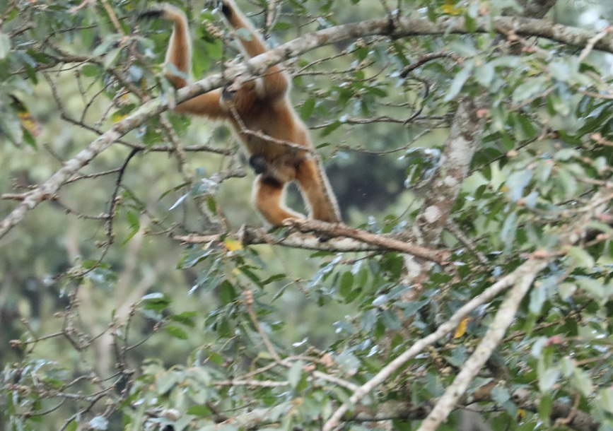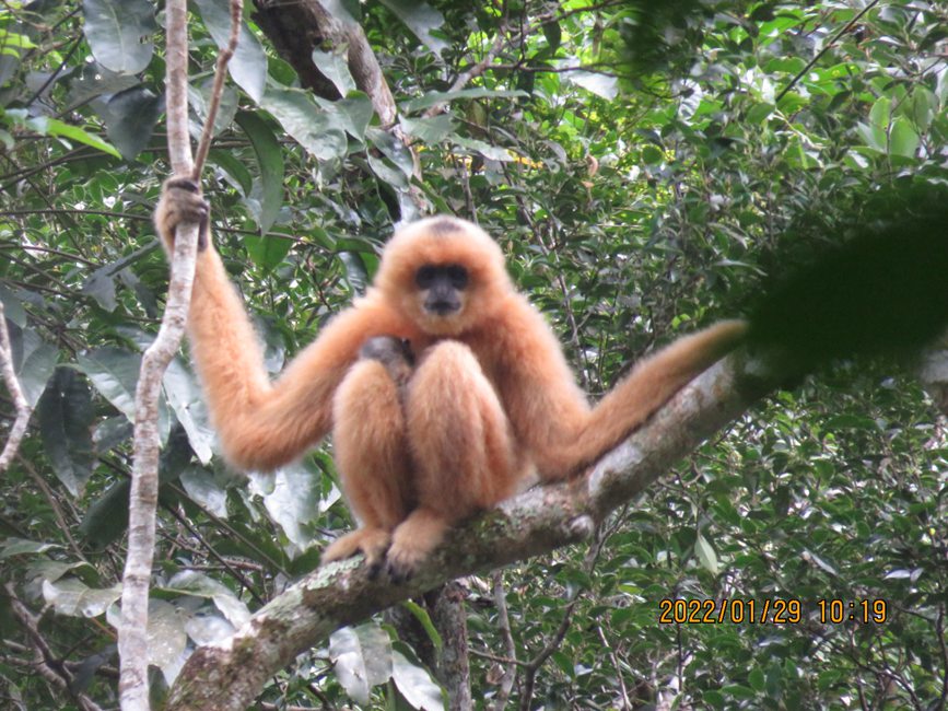 At about 8 a.m. on Jan. 24 when they were monitoring Group D of the Hainan gibbon troupe, two members of the Hainan gibbon monitoring team found a female gibbon sitting on a tree with a newborn baby in her arms. Due to the color of the baby gibbon’s fur, they could surmise that it had been born just several days before they arrived on the scene.