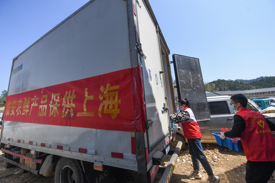 Volunteers load bamboo shoots to a cold-chain truck for Shanghai in Taihuyuan Township of Lin'an District of Hangzhou, east China's Zhejiang Province, April 7, 2022. (Xinhua/Xu Yu)