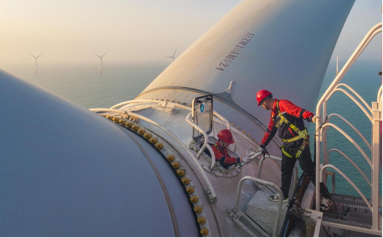 Technicians maintain a wind turbine at a wind farm in Zhuhai, south China's Guangdong province, April 12, 2021. (Photo by Qiu Xinsheng/People's Daily Online)