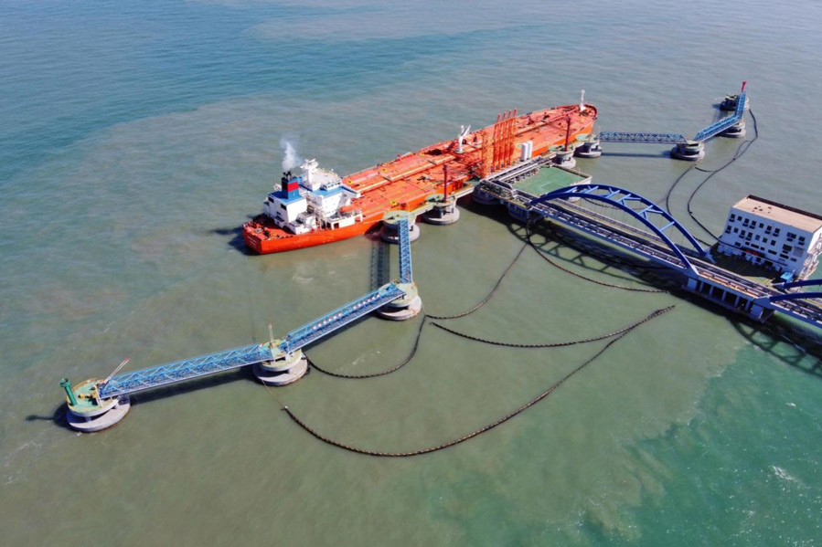 An oil tanker docks at a terminal in Yantai, east China's Shandong province, Oct. 12, 2021. (Photo by Tang Ke/People's Daily Online)