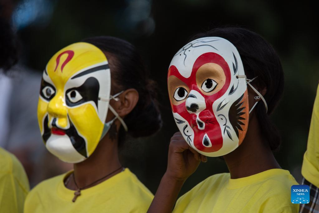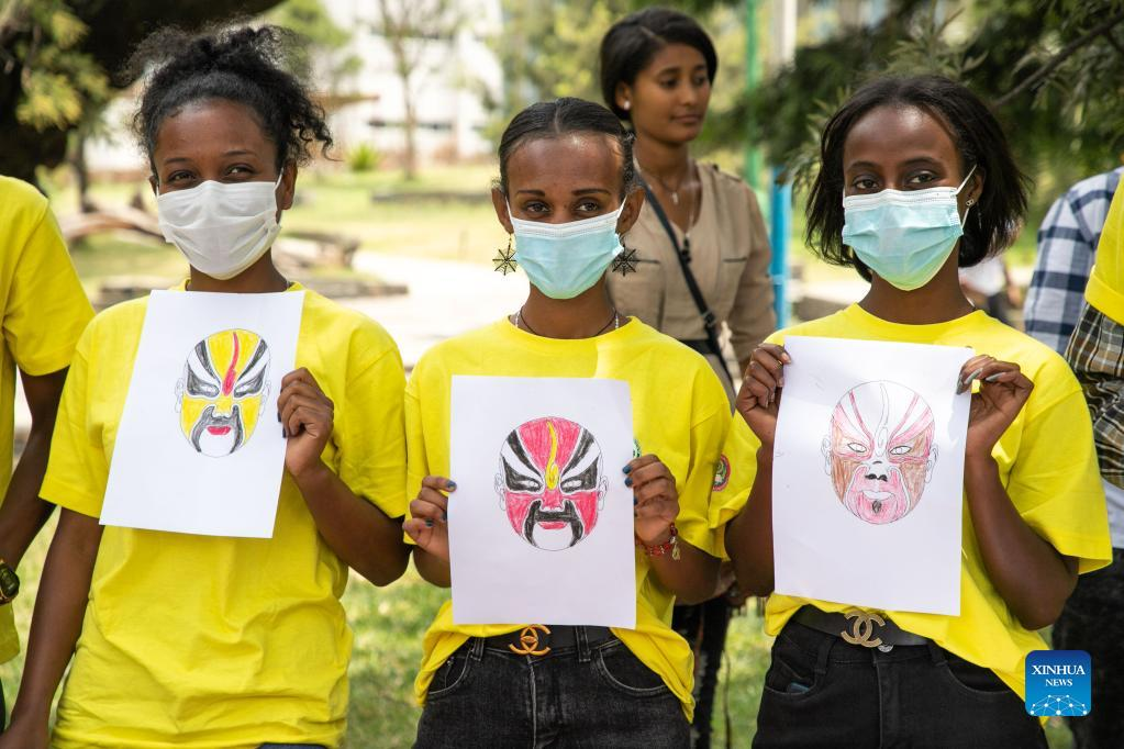 Students wearing Peking Opera masks attend the Chinese Language Day celebrations at Addis Ababa University in Addis Ababa, Ethiopia, on April 15, 2022. Addis Ababa University (AAU) on Friday marked the upcoming UN Chinese Language Day with various cultural activities aimed at promoting the Chinese language and culture. (Xinhua/Michael Tewelde)