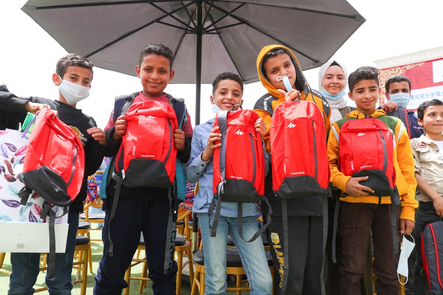 Children show backpacks gotten at a charitable event held by the Chinese Chamber of Commerce in Egypt, in Cairo, Egypt, on April 16, 2022. (Xinhua/Sui Xiankai)