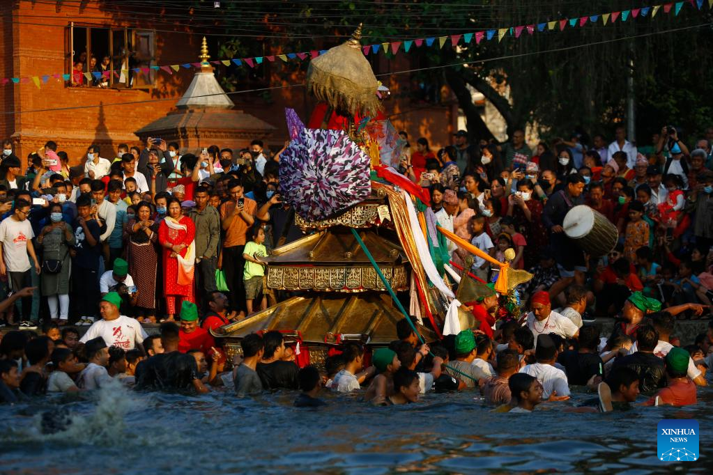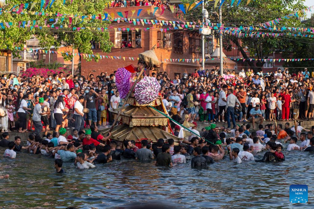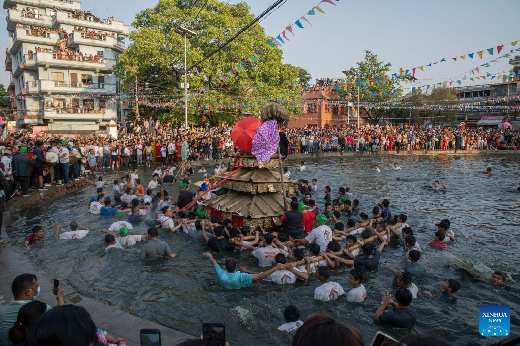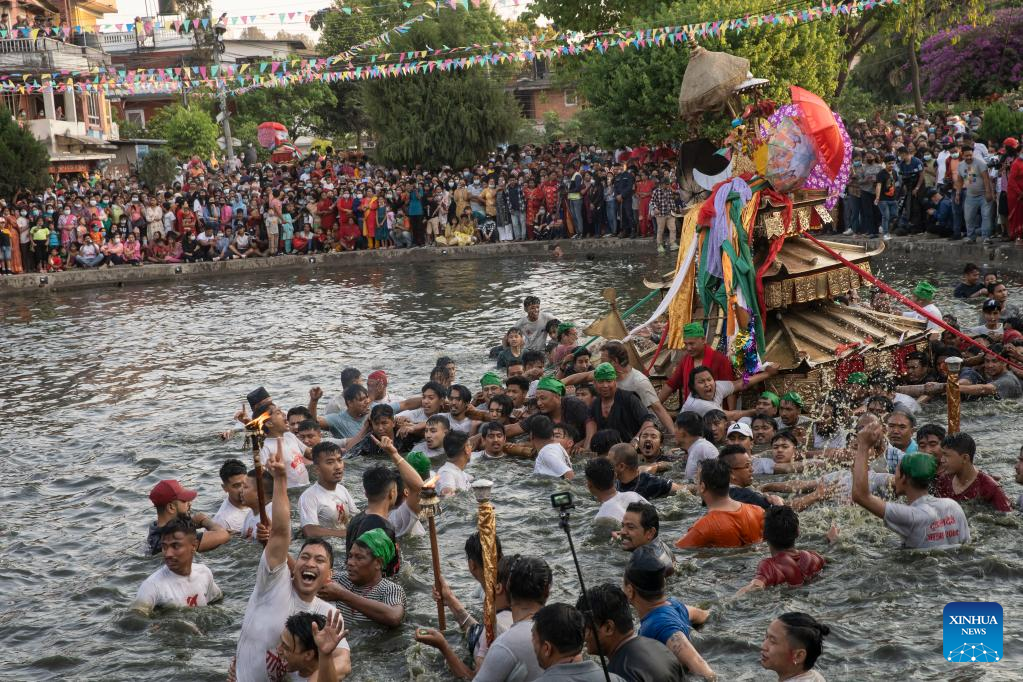 Local people carry the chariot of Tundaldevi on their shoulders and search for the lost jewellery during the traditional "Gahana Khojne Jatra" festival in Gahana Pokhari (Jewel-Pond) in Kathmandu, Nepal, April 17, 2022. (Photo by Hari Maharjan/Xinhua)